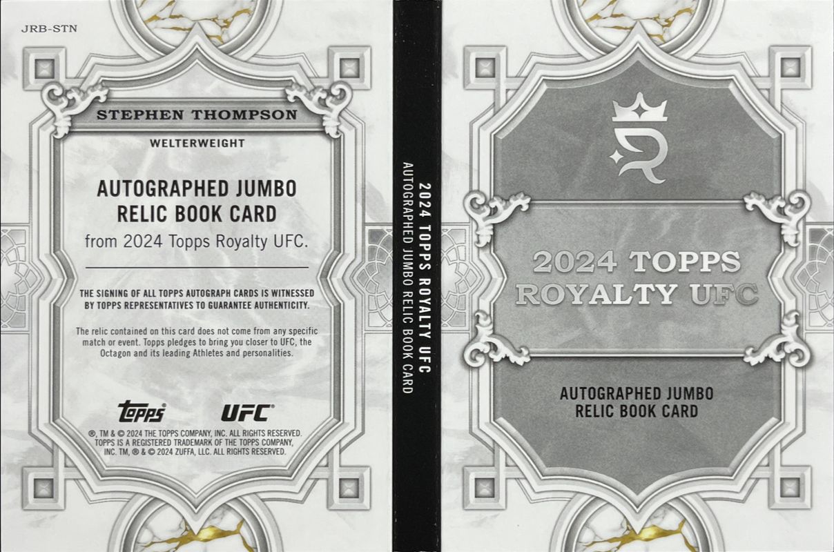 The Stephen Thompson 2024 Topps UFC Royalty #JRB-STN Autographed Jumbo Relic Booklet - Green /5 card is 1 of 23 Stephen Thompson's card variations in the 2024 Topps UFC Royalty set being tracked by Sports Card Investor, including Regalia Relics /99, Regalia Relic Signatures /99, Relic Jewels /99, Influential Ink /49, and Autographed Jumbo Relic Booklet /25.