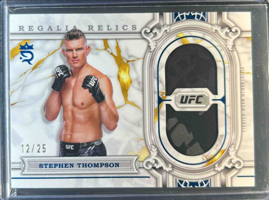 The Stephen Thompson 2024 Topps UFC Royalty #RAR-2 Regalia Relics - Blue /25 card is 1 of 23 Stephen Thompson's card variations in the 2024 Topps UFC Royalty set being tracked by Sports Card Investor, including Regalia Relics /99, Regalia Relic Signatures /99, Relic Jewels /99, Influential Ink /49, and Autographed Jumbo Relic Booklet /25.