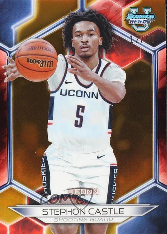 This card is 1 of 78 Stephon Castle's card variations in the 2023 Bowman Best University set being tracked by Sports Card Investor, including Base, Refractor, Speckle Refractor, Blue Refractor /150, and Pink Lava Refractor /100.
