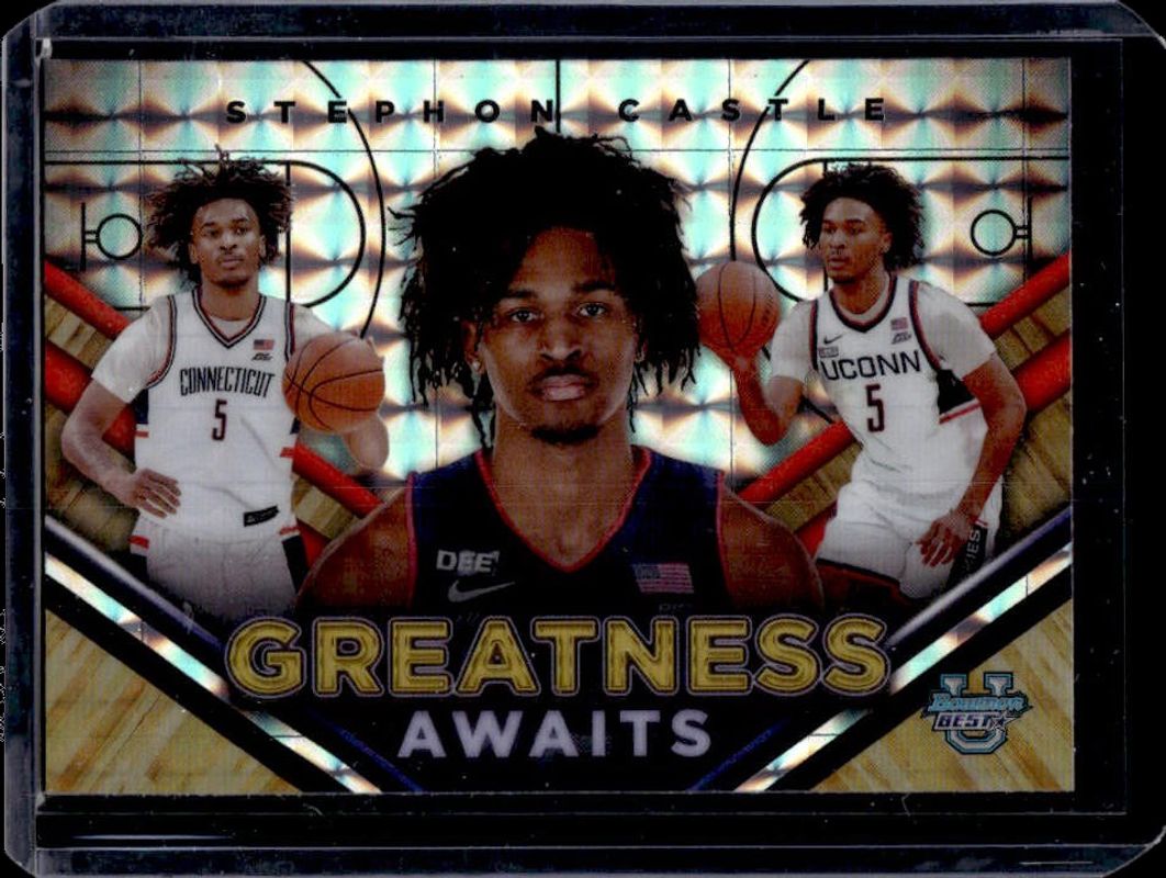 The Stephon Castle 2023 Bowman Best University #GA-20 Greatness Awaits - Geometric Refractor card is 1 of 78 Stephon Castle's card variations in the 2023 Bowman Best University set being tracked by Sports Card Investor, including Base, Refractor, Speckle Refractor, Blue Refractor /150, and Pink Lava Refractor /100.