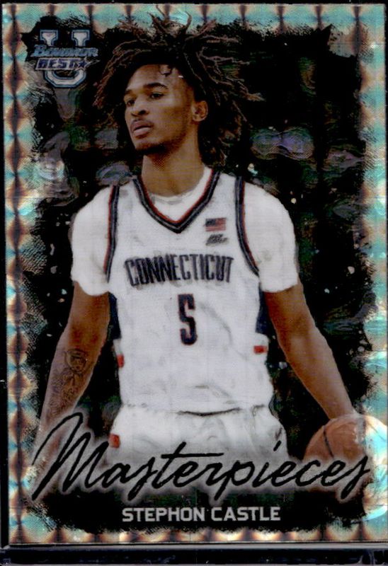 The Stephon Castle 2023 Bowman Best University #BM-5 Masterpieces - Geometric Refractor card is 1 of 78 Stephon Castle's card variations in the 2023 Bowman Best University set being tracked by Sports Card Investor, including Base, Refractor, Speckle Refractor, Blue Refractor /150, and Pink Lava Refractor /100.