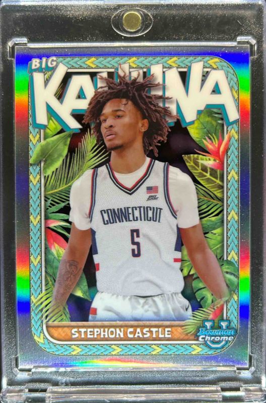 The Stephon Castle 2023 Bowman Chrome University #BK-10 The Big Kahuna card is 1 of 75 Stephon Castle's card variations in the 2023 Bowman Chrome University set being tracked by Sports Card Investor, including #88 Base, #88b Base, #88 Pink Refractor, #88 Purple Shimmer Refractor, and #88 Refractor.
