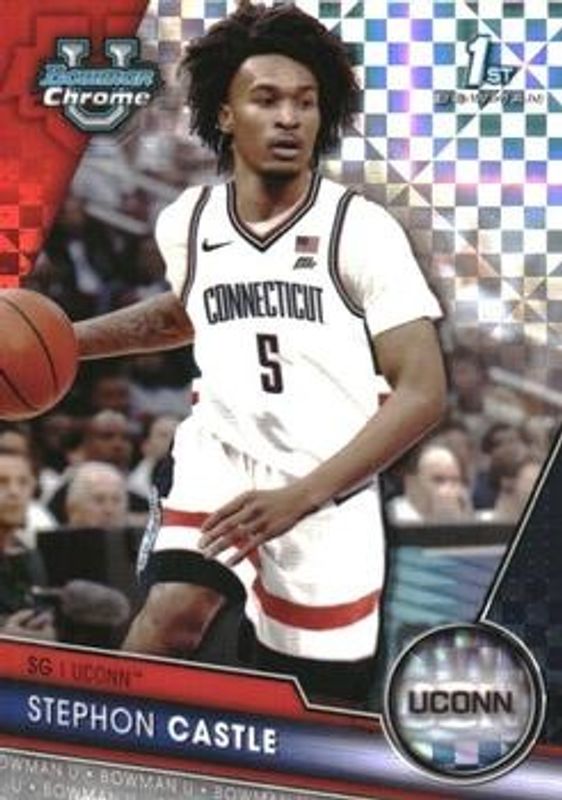 The Stephon Castle 2023 Bowman Chrome University #88 X-Fractor card is 1 of 75 Stephon Castle's card variations in the 2023 Bowman Chrome University set being tracked by Sports Card Investor, including #88 Base, #88b Base, #88 Pink Refractor, #88 Purple Shimmer Refractor, and #88 Refractor.