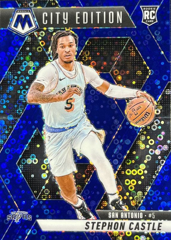 The Stephon Castle 2024 Mosaic #290 City Edition - Fast Break Blue /85 Rookie card in Raw condition has moved up $0.50 (+2.2%) in the last 30 days and was last sold for $23.50 .