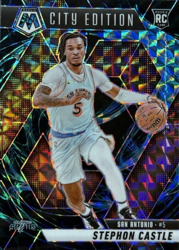 This card is 1 of 203 Stephon Castle's card variations in the 2024 Mosaic set being tracked by Sports Card Investor, including Base, City Edition, NBA Debut, Choice Red & Green, and City Edition - Choice Red & Green.