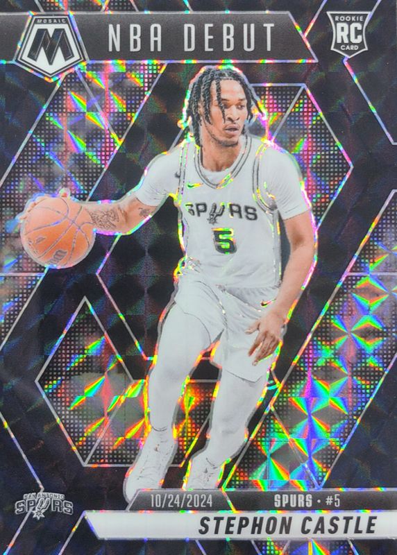The Stephon Castle 2024 Mosaic #267 NBA Debut - Black /1 Rookie card in Raw condition has not changed in price in the last 30 days and was last sold for $2,855.00 .