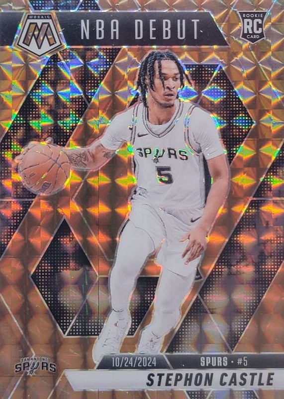 The Stephon Castle 2024 Mosaic #267 NBA Debut - Bronze /75 Rookie card in Raw condition has moved down -$0.01 (-0.0%) in the last 30 days and was last sold for $29.99 .