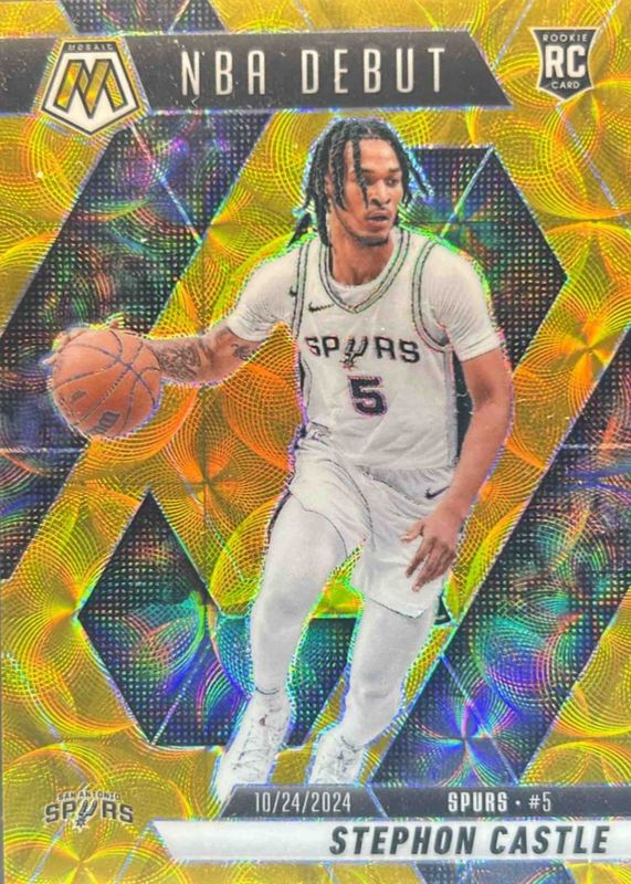 The Stephon Castle 2024 Mosaic #267 NBA Debut - International Gold /10 Rookie card in Raw condition has not changed in price in the last 30 days and was last sold for $202.50 .