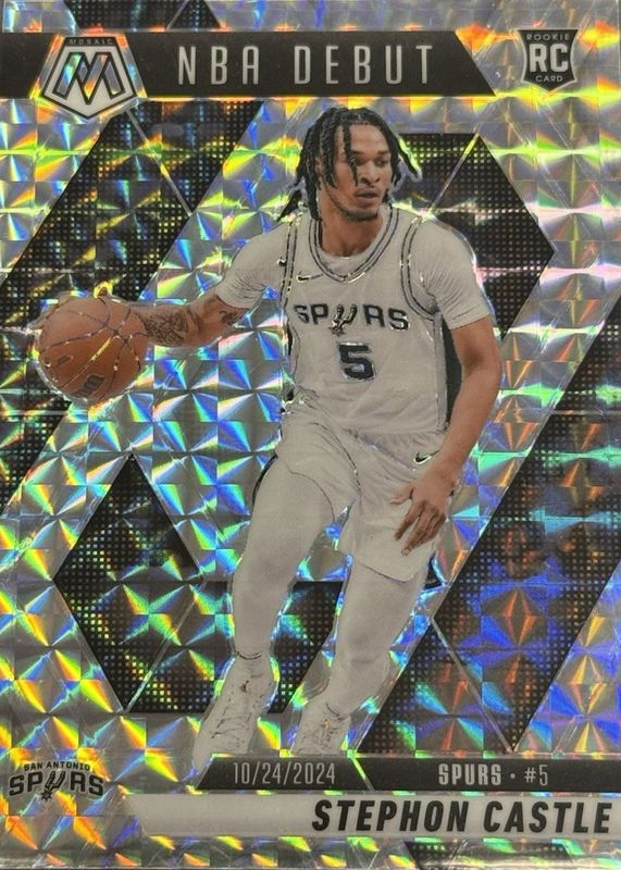The Stephon Castle 2024 Mosaic #267 NBA Debut - Silver Rookie card in Raw condition has moved up $1.90 (+56.7%) in the last 30 days and was last sold for $5.25 .