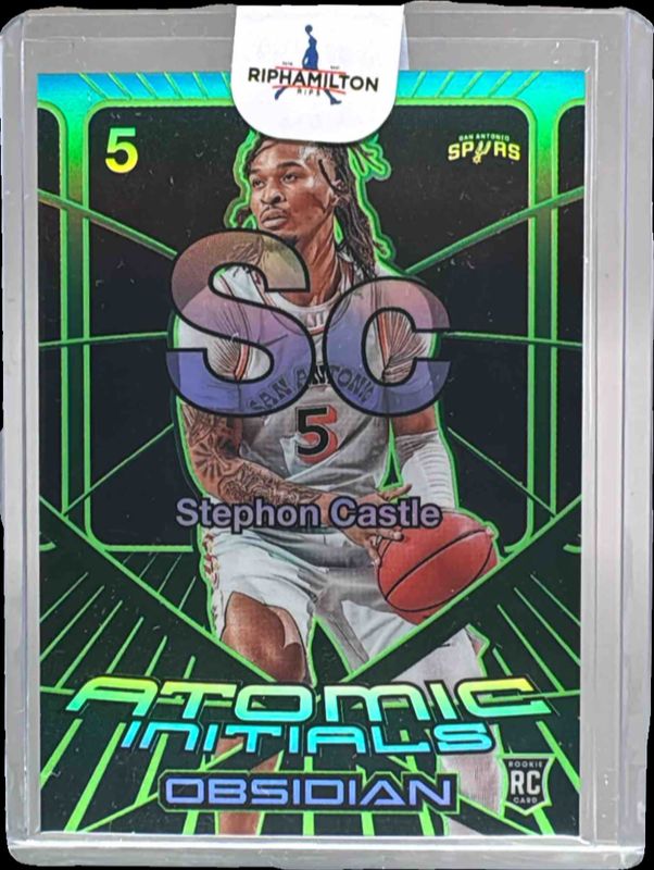 The Stephon Castle 2024 Obsidian #2 Atomic Initials - Electric Etch Green Flood /25 Rookie card is 1 of 137 Stephon Castle's card variations in the 2024 Obsidian set being tracked by Sports Card Investor, including Base, Electric Etch Caldera, Electric Etch International, Electric Etch Pink Pulsar, and Electric Etch Red Flood.
