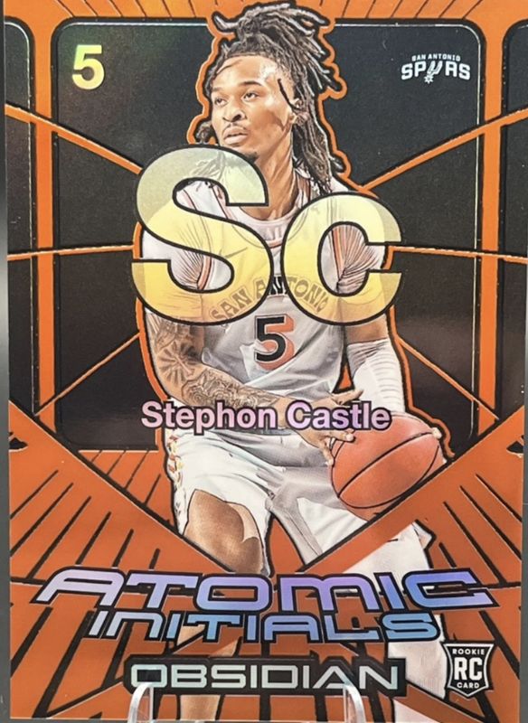 The Stephon Castle 2024 Obsidian #2 Atomic Initials - Electric Etch Orange Flood /99 Rookie card is 1 of 137 Stephon Castle's card variations in the 2024 Obsidian set being tracked by Sports Card Investor, including Base, Electric Etch Caldera, Electric Etch International, Electric Etch Pink Pulsar, and Electric Etch Red Flood.