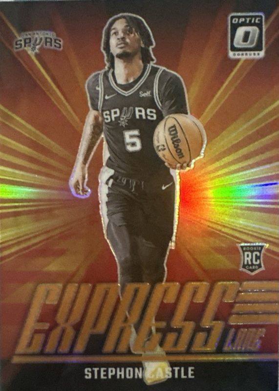 The Stephon Castle 2024 Optic #1 Express Lane - Orange /39 Rookie card in Raw condition has not changed in price in the last 30 days and was last sold for $57.00 .