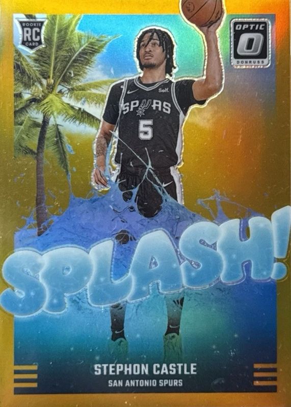The Stephon Castle 2024 Optic #14 Splash! - Gold /10 Rookie card in Raw condition has not changed in price in the last 30 days and was last sold for $510.00 .