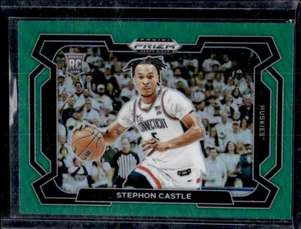The Stephon Castle 2024 Prizm Draft Picks #17b Green Rookie card is 1 of 162 Stephon Castle's card variations in the 2024 Prizm Draft Picks set being tracked by Sports Card Investor, including #17 Base, #17b Base, #17 Variation, #17 Green, and #17b Green Wave.