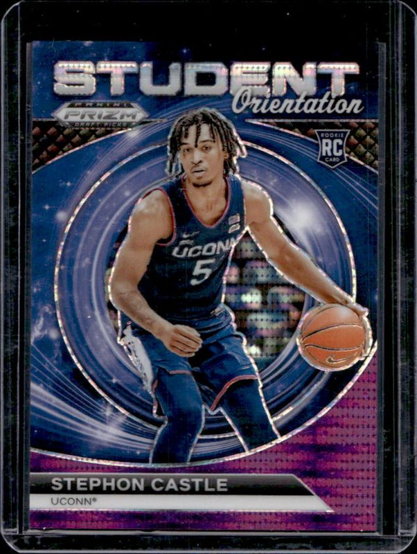 The Stephon Castle 2024 Prizm Draft Picks #13 Student Orientation - Purple Pulsar /55 Rookie card is 1 of 162 Stephon Castle's card variations in the 2024 Prizm Draft Picks set being tracked by Sports Card Investor, including #17b Base, #17 Base, #17 Variation, #17b Green, and #17 Green.