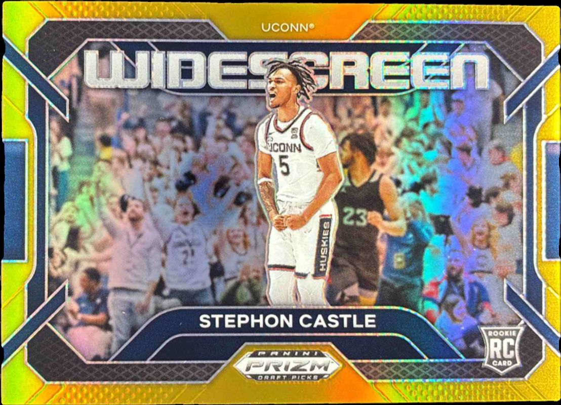 The Stephon Castle 2024 Prizm Draft Picks #8 Widescreen - Gold /10 Rookie card is 1 of 162 Stephon Castle's card variations in the 2024 Prizm Draft Picks set being tracked by Sports Card Investor, including #17b Base, #17 Base, #17 Variation, #17b Green, and #17 Green.