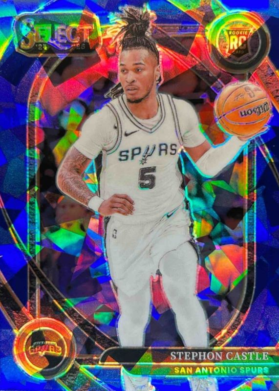 The Stephon Castle 2024 Select #292 Courtside Blue Cracked Ice Rookie card in Raw condition has moved up $3.45 (+20.9%) in the last 30 days and was last sold for $19.95 .