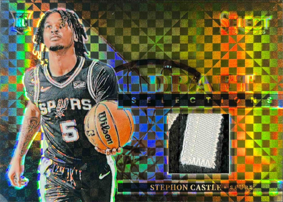 The Stephon Castle 2024 Select #DSM-CAS Draft Selections Memorabilia Gold /10 Rookie card is 1 of 314 Stephon Castle's card variations in the 2024 Select set being tracked by Sports Card Investor, including Concourse, Courtside, Mezzanine, Premier Level, and Concourse Blue Cracked Ice.
