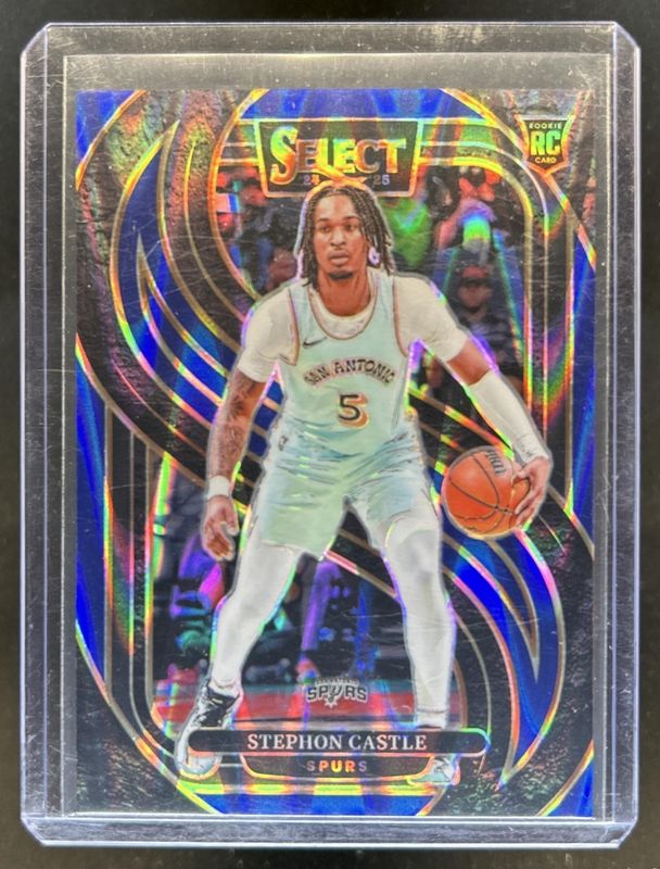The Stephon Castle 2024 Select #175 Premier Level Blue Flash /99 Rookie card is 1 of 314 Stephon Castle's card variations in the 2024 Select set being tracked by Sports Card Investor, including Concourse, Courtside, Mezzanine, Premier Level, and Concourse Blue Cracked Ice.