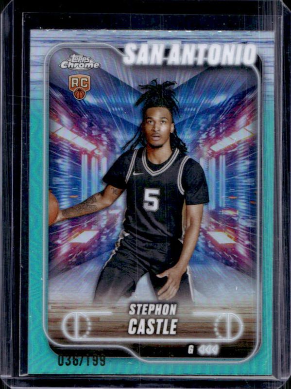 The Stephon Castle 2024 Topps Chrome #122 Aqua Refractor /199 Rookie card is 1 of 141 Stephon Castle's card variations in the 2024 Topps Chrome set being tracked by Sports Card Investor, including Base, Blue Basketball Refractor, Magenta Refractor, Negative Refractor, and Pink Basketball Refractor.