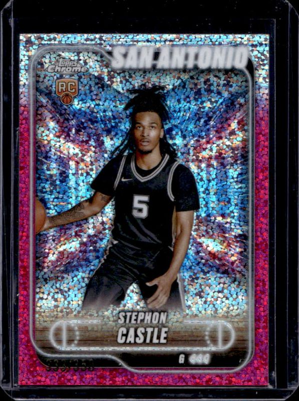 The Stephon Castle 2024 Topps Chrome #122 Magenta Speckle Refractor /350 Rookie card is 1 of 141 Stephon Castle's card variations in the 2024 Topps Chrome set being tracked by Sports Card Investor, including Base, Blue Basketball Refractor, Magenta Refractor, Negative Refractor, and Pink Basketball Refractor.