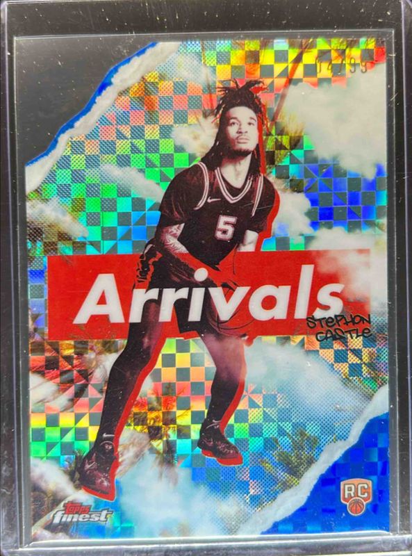 The Stephon Castle 2024 Topps Finest #A-5 Arrivals - Blue X-Fractor /99 Rookie card is 1 of 133 Stephon Castle's card variations in the 2024 Topps Finest set being tracked by Sports Card Investor, including Arrivals, Arrivals - Geometric Refractor, Arrivals - Refractor, Arrivals - X-Fractor, and Base Common.