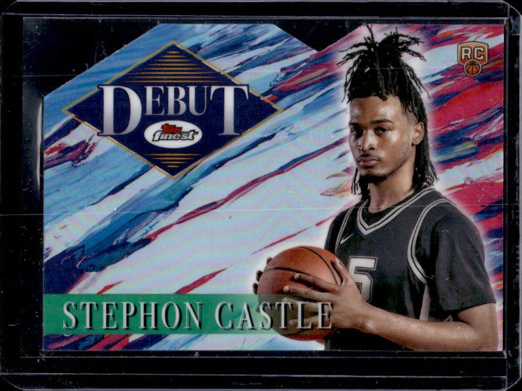 The Stephon Castle 2024 Topps Finest #D-5 Debut - Refractor Rookie card is 1 of 133 Stephon Castle's card variations in the 2024 Topps Finest set being tracked by Sports Card Investor, including Arrivals, Arrivals - Geometric Refractor, Arrivals - Refractor, Arrivals - X-Fractor, and Base Common.