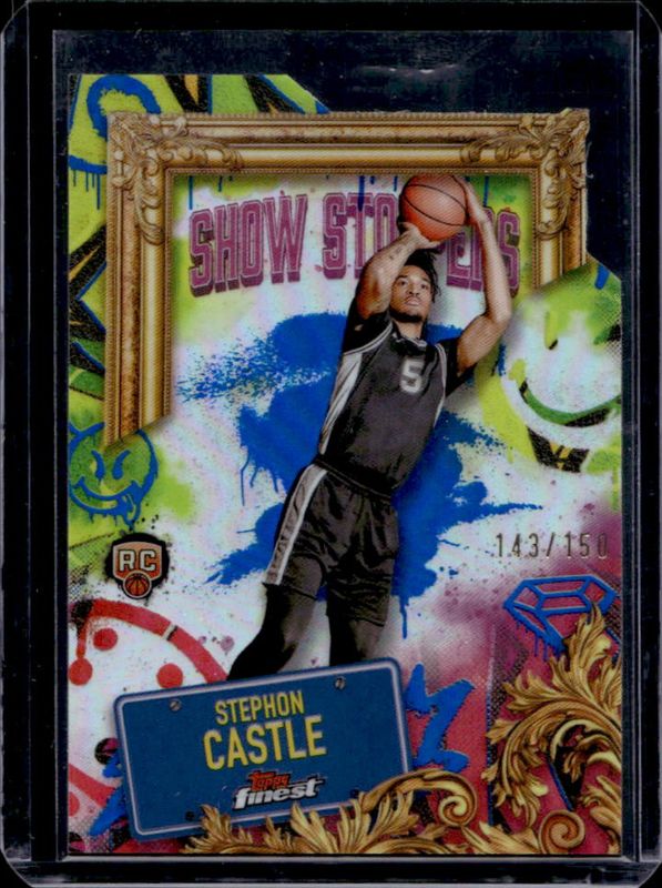 The Stephon Castle 2024 Topps Finest #S-25 Showstoppers - Blue Refractor /150 Rookie card is 1 of 133 Stephon Castle's card variations in the 2024 Topps Finest set being tracked by Sports Card Investor, including Arrivals, Arrivals - Geometric Refractor, Arrivals - Refractor, Arrivals - X-Fractor, and Base Common.