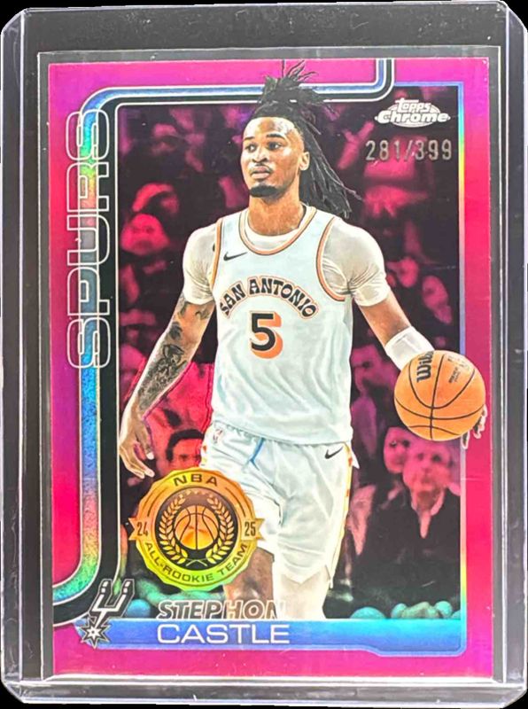 The Stephon Castle 2025 Topps Chrome #228 Magenta Refractor /399 card is 1 of 95 Stephon Castle's card variations in the 2025 Topps Chrome set being tracked by Sports Card Investor, including Base, Basketball Refractor, Box Set Refractor, Image Variation, and Lightboard Logo Refractor.