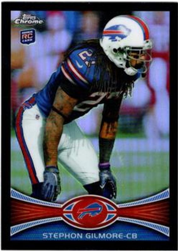 The Stephon Gilmore 2012 Topps Chrome #26 Black Refractor /299 Rookie card is 1 of 19 Stephon Gilmore's card variations in the 2012 Topps Chrome set being tracked by Sports Card Investor, including Base, Blue Wave Refractor, Orange Refractor, Refractor, and X-Fractor.