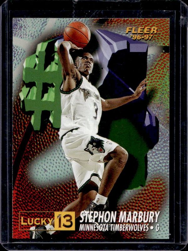 The Stephon Marbury 1996 Fleer #4 Lucky 13 Rookie card is 1 of 4 Stephon Marbury's card variations in the 1996 Fleer set being tracked by Sports Card Investor, including Base, Rookie Sensations, and Thrill Seekers.