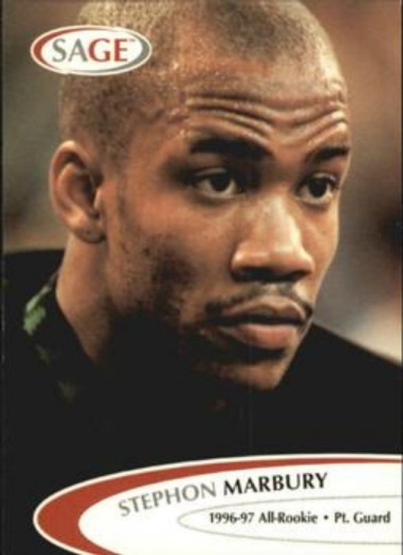 The Stephon Marbury 1998 Sage #27 Base card is 1 of 8 Stephon Marbury's card variations in the 1998 Sage set being tracked by Sports Card Investor, including Autographs Player Proof, Autographs /535, Autographs Bronze /350, Autographs Silver /215, and Autographs Gold /110.