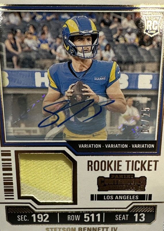 The Stetson Bennett IV 2023 Contenders #TS32V Rookie Ticket Swatches Autographs Variation /25 card in Raw condition has not changed in price in the last 30 days and was last sold for $80.00 .