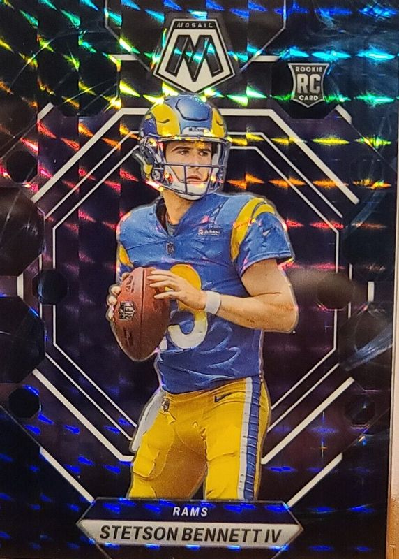 The Stetson Bennett IV 2023 Mosaic #362 Genesis /(SSP) Rookie card in Raw condition has not changed in price in the last 30 days and was last sold for $17.00 .
