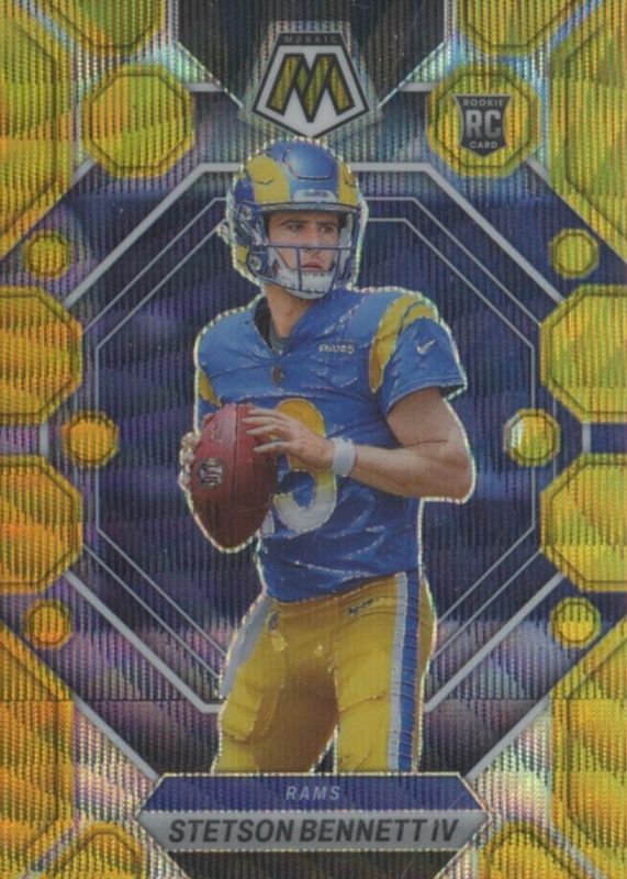 The Stetson Bennett IV 2023 Mosaic #362 Gold Wave /17 Rookie card in Raw condition has not changed in price in the last 30 days and was last sold for $26.51 .