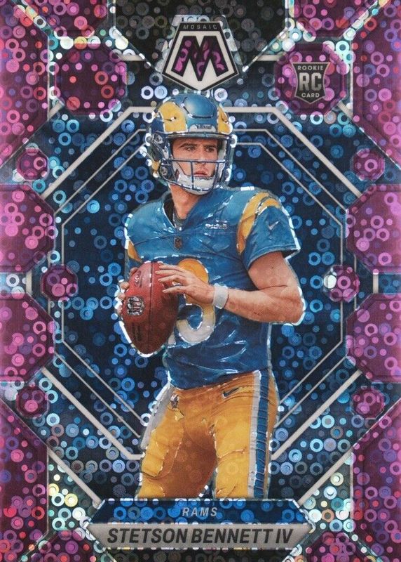 The Stetson Bennett IV 2023 Mosaic #362 No Huddle Purple /50 Rookie card in Raw condition has not changed in price in the last 30 days and was last sold for $11.50 .