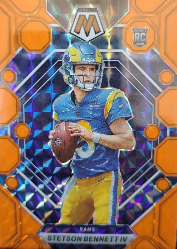 The Stetson Bennett IV 2023 Mosaic #362 Orange Fluorescent /25 Rookie card in Raw condition has not changed in price in the last 30 days and was last sold for $25.00 .