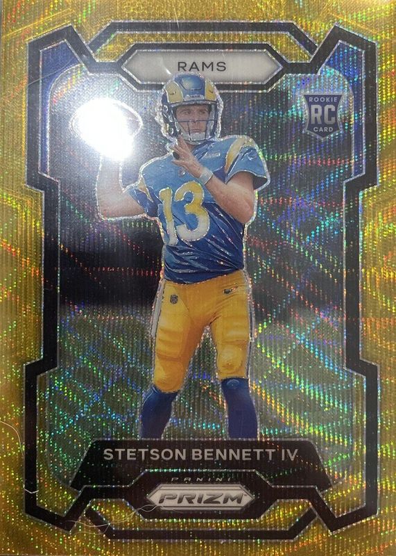 The Stetson Bennett IV 2023 Prizm #358 Gold Wave /10 Rookie card in Raw condition has not changed in price in the last 30 days and was last sold for $140.00 .