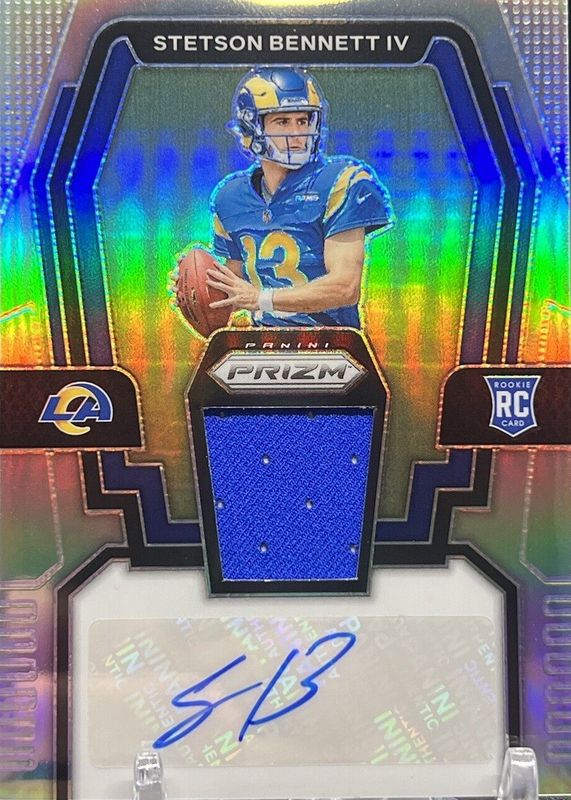 The Stetson Bennett IV 2023 Prizm #RPA-SB Rookie Patch Auto - Silver /99 card in Raw condition has not changed in price in the last 30 days and was last sold for $10.50 .