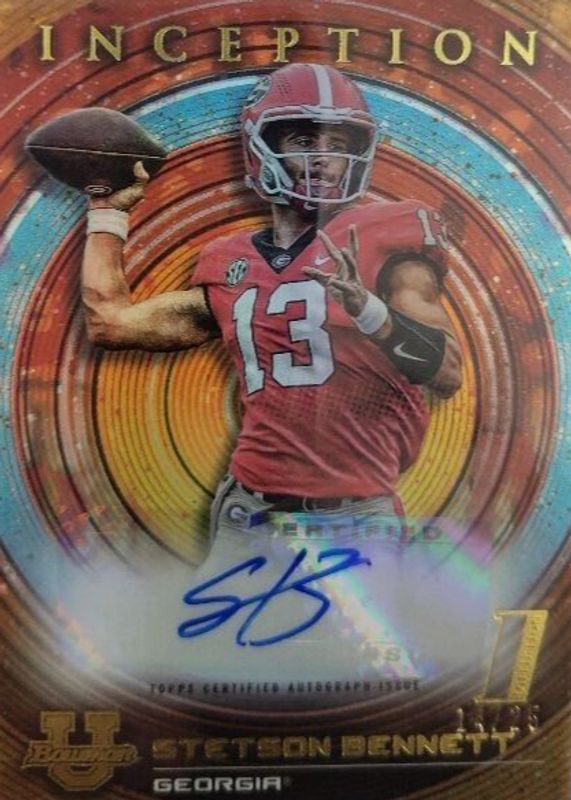 This card is 1 of 7 Stetson Bennett IV's card variations in the 2022 Bowman University Inception set being tracked by Sports Card Investor, including Autographs (1st), Autographs - Blue Foil /99 (1st), Autographs - Fuchsia Foil /75 (1st), Autographs - Gold Foil /50 (1st), and Autographs - Red Foil /5 (1st).