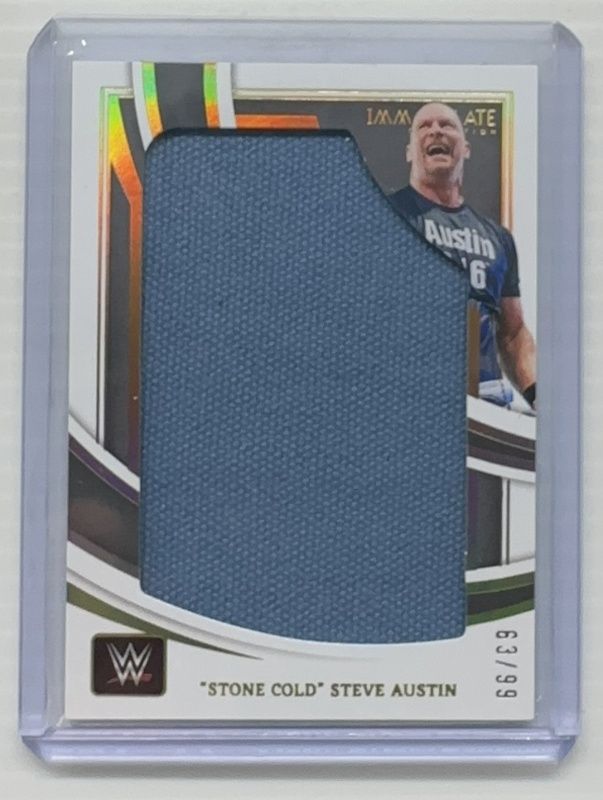 The Steve Austin 2022 Immaculate WWE #RC-SCA Jumbo Ring Canvas /99 card is 1 of 12 Steve Austin's card variations in the 2022 Immaculate WWE set being tracked by Sports Card Investor, including Base /99, Red /25, Gold /10, Green /5, and Platinum /1.