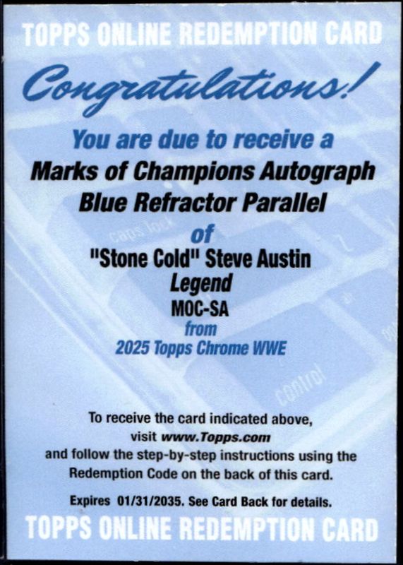 Steve Austin 2025 Topps Chrome WWE #MOC-SA Marks of Champions Autographs - Blue Refractor /150 RAW Price Guide
