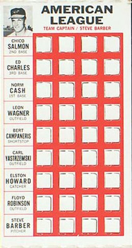 Other popular players in the 1967 Topps Punch-Outs set include Al Kaline, Andy Etchebarren, Bill Freehan, Bill Mazeroski, and Bill White.
