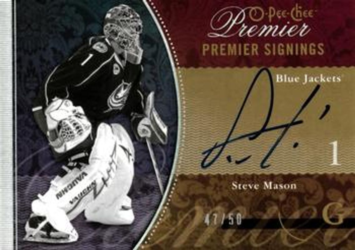 The Steve Mason 2009 O-Pee-Chee Premier #PS-SM Signings /50 card is 1 of 13 Steve Mason's card variations in the 2009 O-Pee-Chee Premier set being tracked by Sports Card Investor, including Base /299, Gold /25, Black /10, Gold Spectrum /10, and Gold Spectrum Autographs /1.