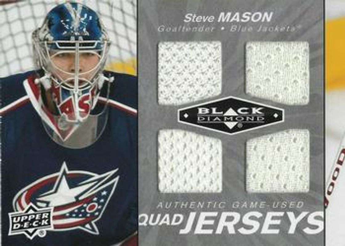 The Steve Mason 2010 Upper Deck Black Diamond #QJ-SM Jerseys Quad card is 1 of 10 Steve Mason's card variations in the 2010 Upper Deck Black Diamond set being tracked by Sports Card Investor, including Base, Ruby /100, Gold /10, Platinum /1, and 2010 Upper Deck Ice /1999.