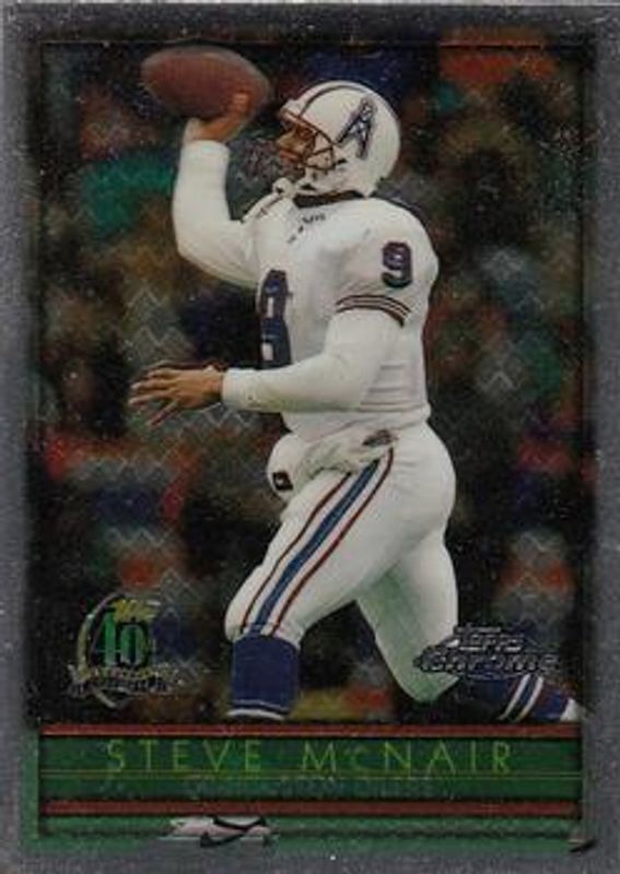The Steve McNair 1996 Topps Chrome #90 Base card is 1 of 2 Steve McNair's card variations in the 1996 Topps Chrome set being tracked by Sports Card Investor, including Refractor.