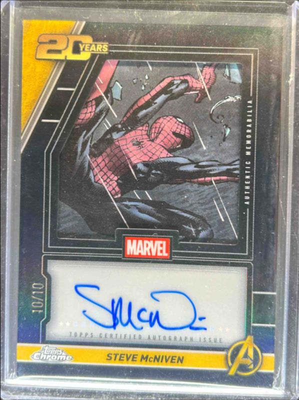 The Steve McNiven 2025 Topps Chrome #AR-1 The New Avengers 20th Anniversary Autographs Relics - Black /10 card is 1 of 15 Steve McNiven's card variations in the 2025 Topps Chrome set being tracked by Sports Card Investor, including Marvel Comic Book Artist & Writer Autographs, Marvel Comic Book Artist & Writer Autographs - Iron Man Red & Gold Lazer Refractor /100, Marvel Comic Book Artist & Writer Autographs - Hulk Green Lazer Refractor /99, Marvel Comic Book Artist & Writer Autographs - Purple Shimmer Refractor /75, and Marvel Comic Book Artist & Writer Autographs - Gold Wave Refractor /50.