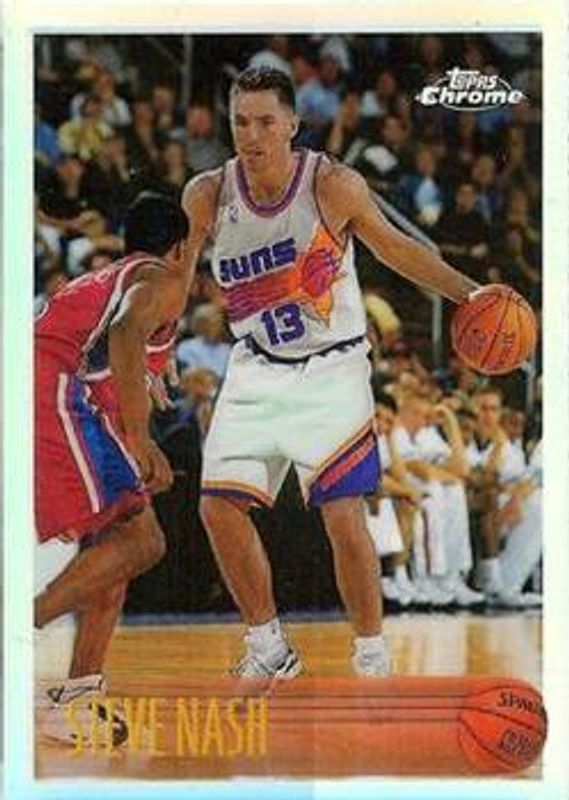 The Steve Nash 1996 Topps Chrome #182R Refractor Rookie card is 1 of 3 Steve Nash's card variations in the 1996 Topps Chrome set being tracked by Sports Card Investor, including Base, and Refractor.