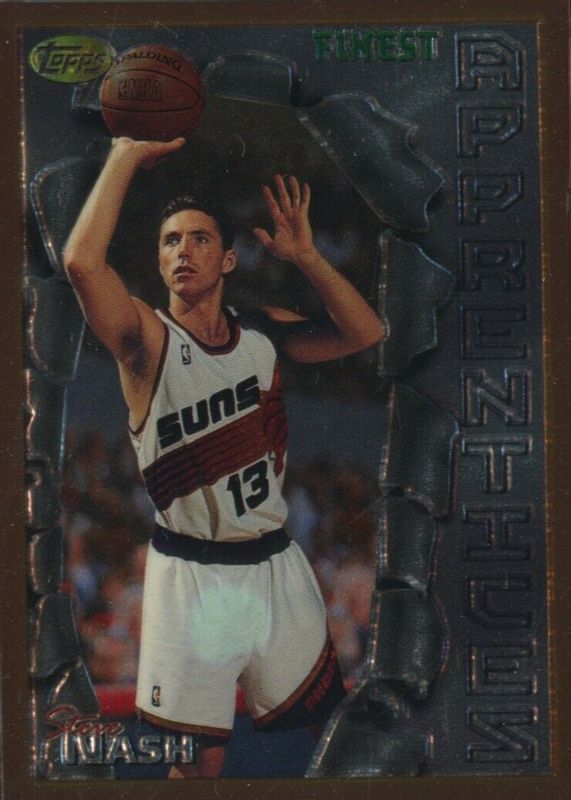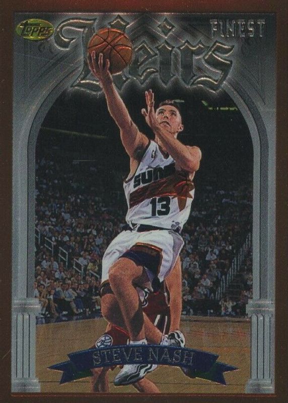 The Steve Nash 1996 Topps Finest #217 Bronze - Base (No Coating) Rookie card in Raw condition has moved down -$2.05 (-40.7%) in the last 30 days and was last sold for $2.99 .