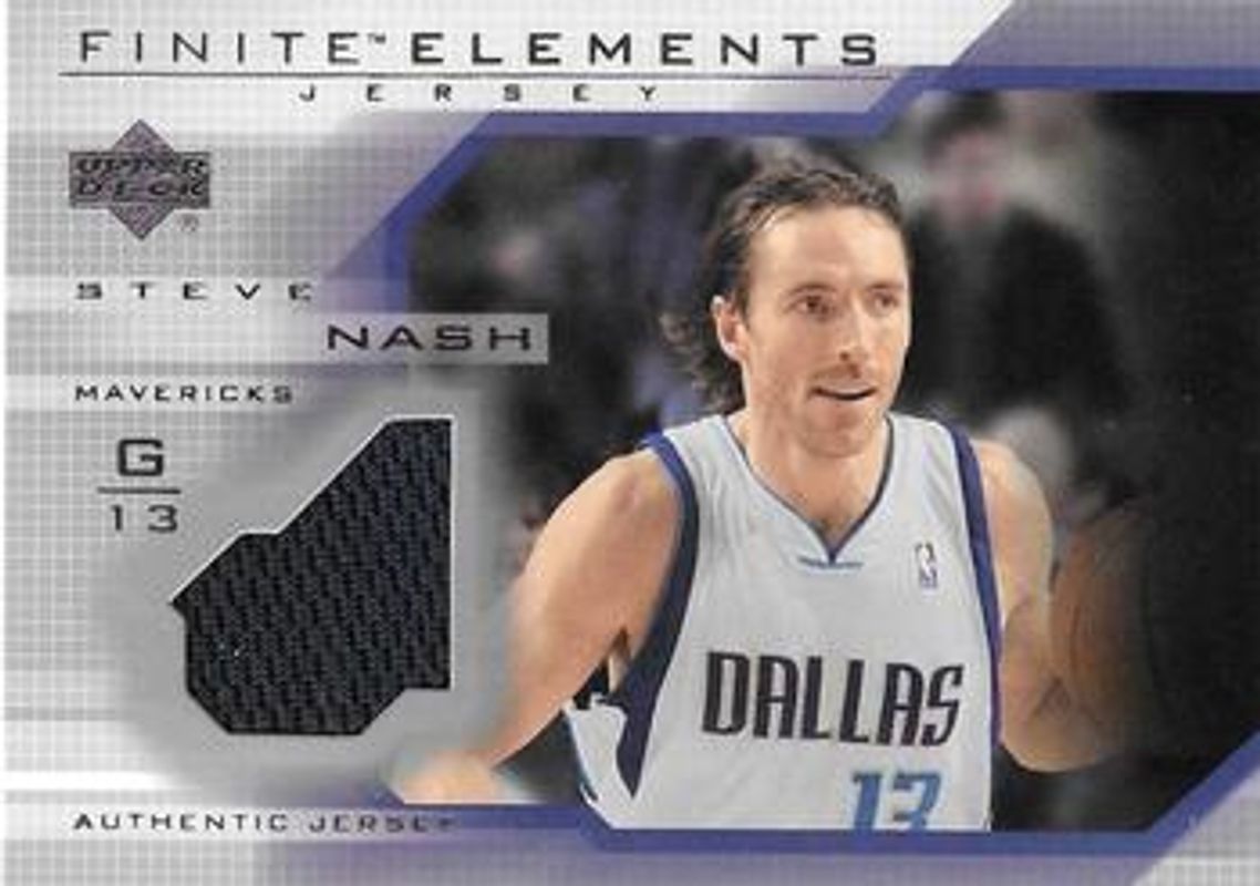 The Steve Nash 2003 Upper Deck Finite #FJ12 Elements Jerseys card is 1 of 7 Steve Nash's card variations in the 2003 Upper Deck Finite set being tracked by Sports Card Investor, including #31 Base /500, #296 Base /500, #31 Gold /25, #296 Gold /25, and #31 Platinum /1.